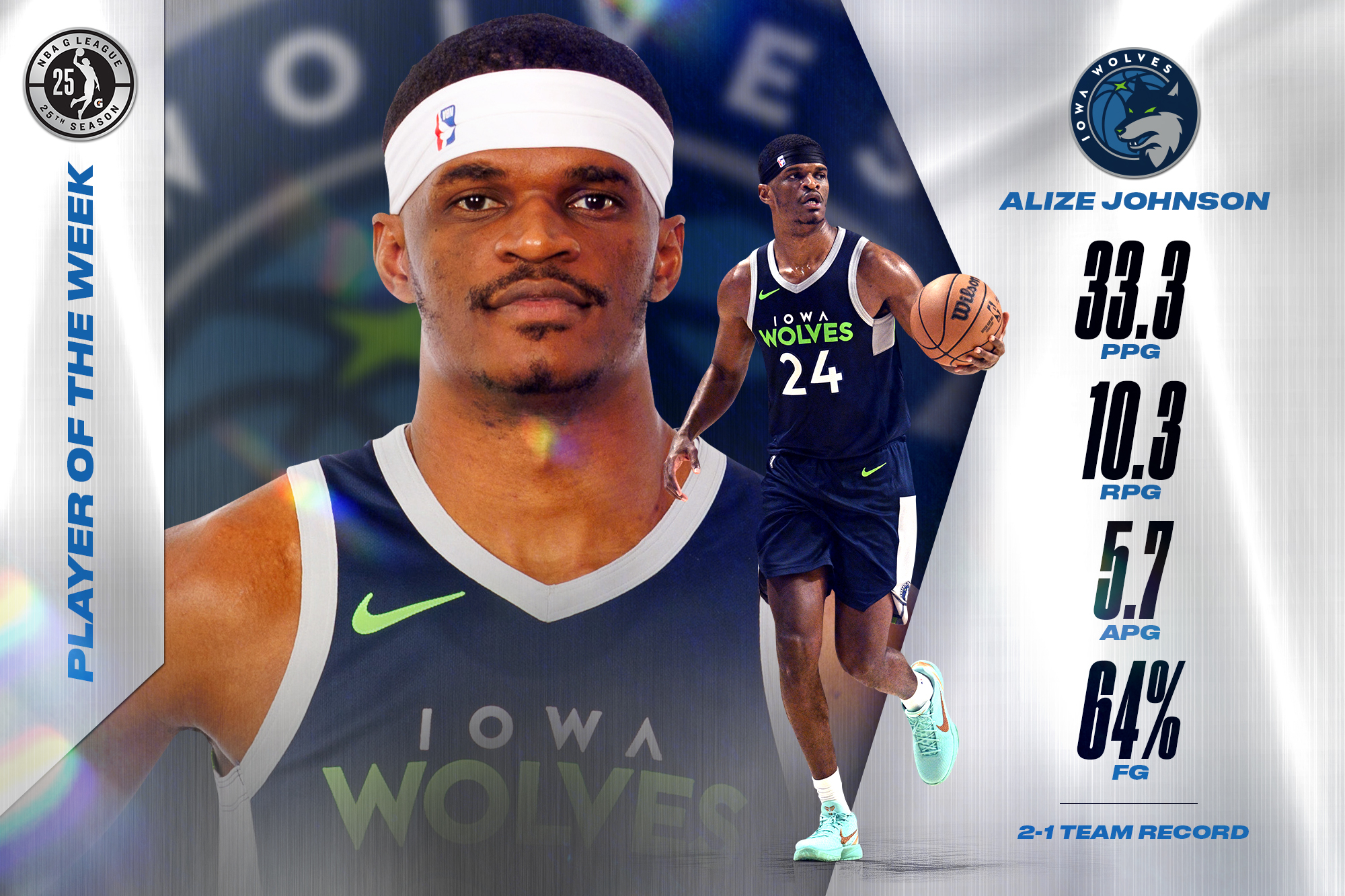 Johnson started the week on Jan. 13 with a 28-point performance against the Valley Suns, going 10-of-17 from the field while grabbing a game-high 12 rebounds and dishing out a game-high-tying seven assists in a 130-123 win over the Sun. On Jan. 15, he scored a game-high and career-high 41 points on 12-of-15 shooting, including a perfect 8-of-8 from three and 6-of-7 from the foul line to go along with a game-high 10 rebounds and five assists, leading the Wolves to a 137-127 win over the Suns. Johnson wrapped up the week on Jan. 18 against the Long Island Nets, finishing with 31 points on 10-of-18 shooting, including 3-of-6 from deep, a game-high nine rebounds, a team-high five assists and a team-high and season-high four steals.
