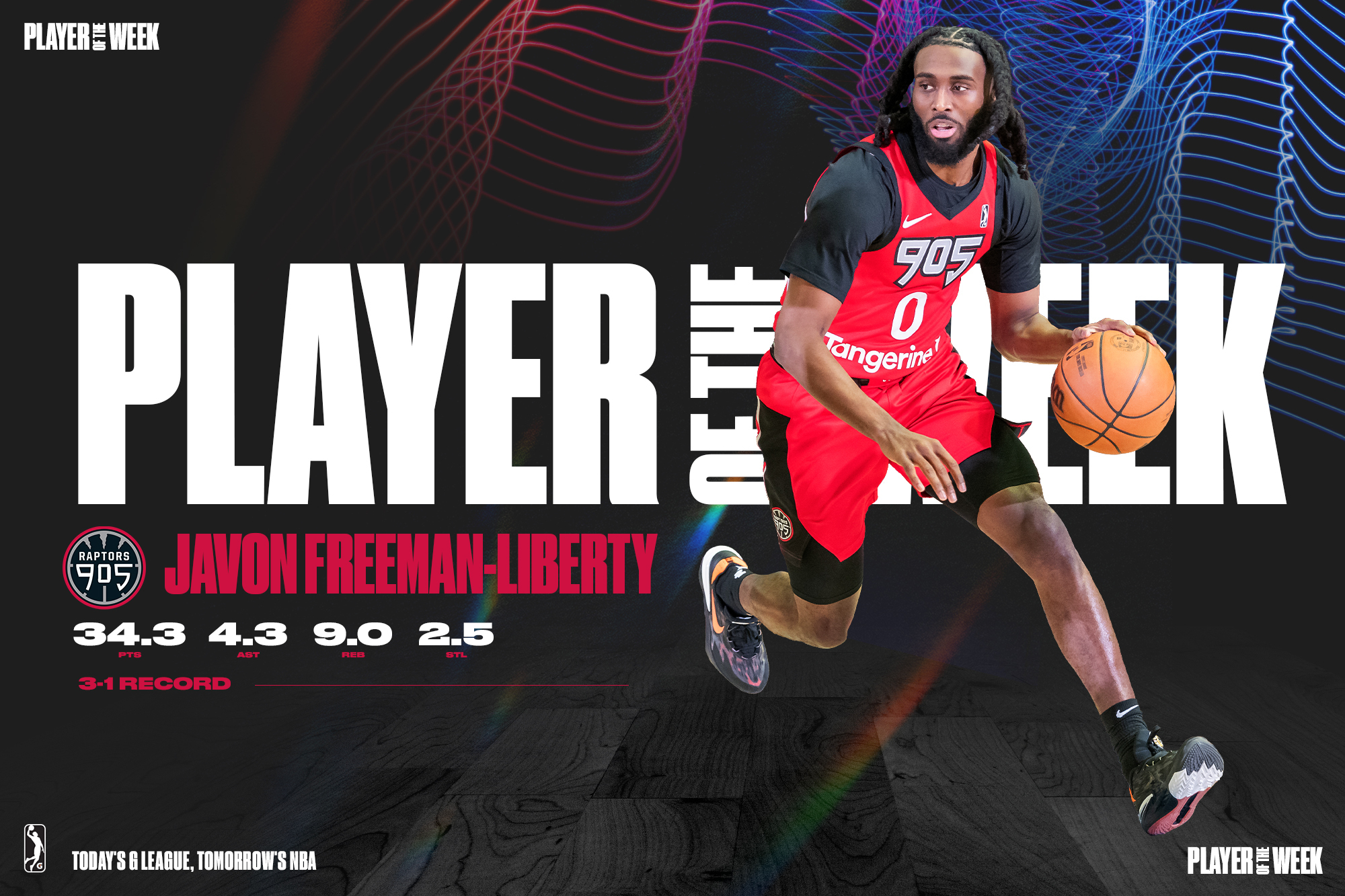 Raptors 905 two-way guard, Javon Freeman-Liberty has been named the NBA G League Player of the Week for games played from Monday, Feb. 12 to Sunday, Feb. 25, the league announced today. Freeman-Liberty averaged 34.3 points, 9.3 rebounds, 4.3 assists, and 1.4 steals in four games, helping the 905 tally a 3-1 record through that time.