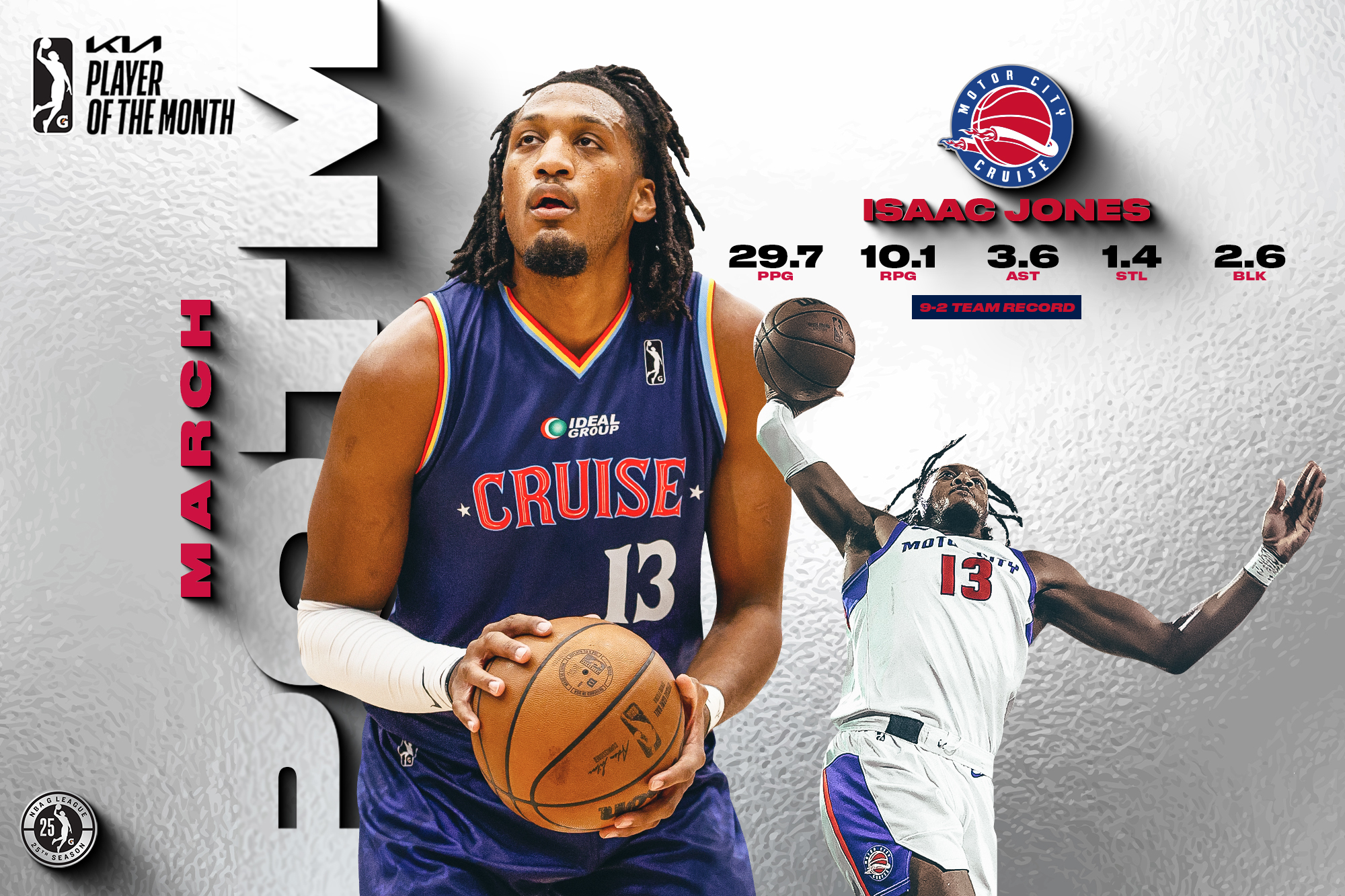 DETROIT, Mich. – The Motor City Cruise, NBA G League affiliate of the Detroit Pistons, announced today that forward-center Isaac Jones has been named Kia NBA G League Player of the Month for March. Jones becomes the second player in franchise history to earn the honor, joining Saben Lee (November 2021).