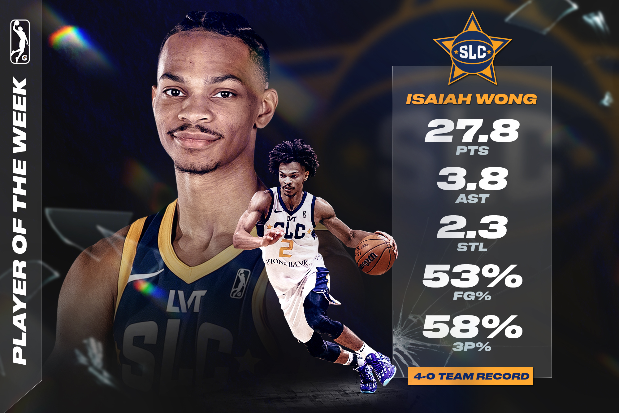 SALT LAKE CITY (November 26, 2024) — The NBA G League announced today that Salt Lake City Stars guard Isaiah Wong has been named NBA G League Player of the Week for games played from Monday, Nov. 18, through Sunday, Nov. 24. This marks his first Player of the Week accolade, helping the Stars to a perfect 4-0 record at home on the week.