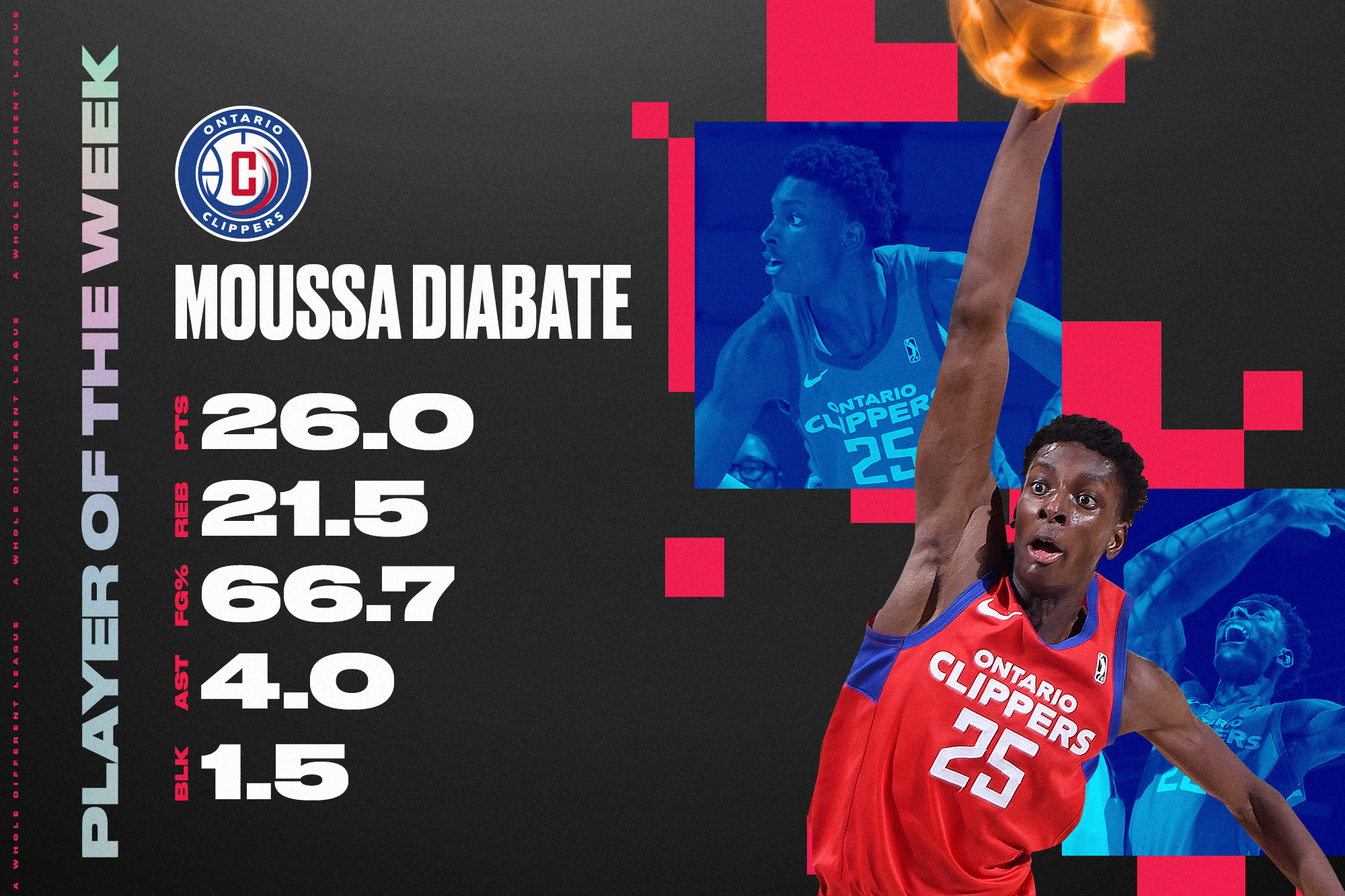 The NBA G League announced today that Ontario Clippers center Moussa Diabate has been named G League Player of the Week for games played from Monday, December 5, through Sunday, December 11. This is Diabate's first Player of the Week award in his rookie season. During the week, Diabate led the team to a 2-0 record while averaging 26.0 points, 21.5 rebounds and 4.0 assists per game.