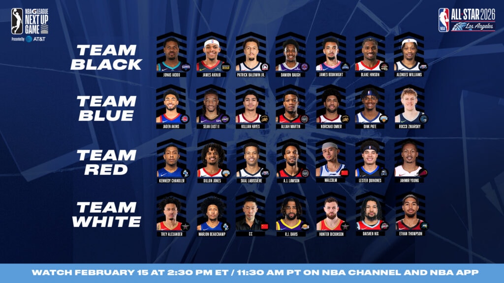 The NBA G League Next Up Game presented by AT&T will take place during NBA All-Star 2026 on Sunday, Feb. 15, at 2:30 p.m. ET / 11:30 a.m. PT in Los Angeles and will air on the NBA Channel and NBA App from 11:30 a.m. PT to 1:30 p.m. PT (2:30 p.m. to 4:30 p.m. ET). The NBA Channel is available free on Roku, Samsung, Tubi, Pluto, Fire TV, Prime Video, Xumo, Fubo, Xfinity, DirecTV, and DISH. The game will be played at NBA Crossover inside the Los Angeles Convention Center and will feature a four-team, tournament-style format showcasing some of the NBA G League’s most exciting players.
